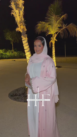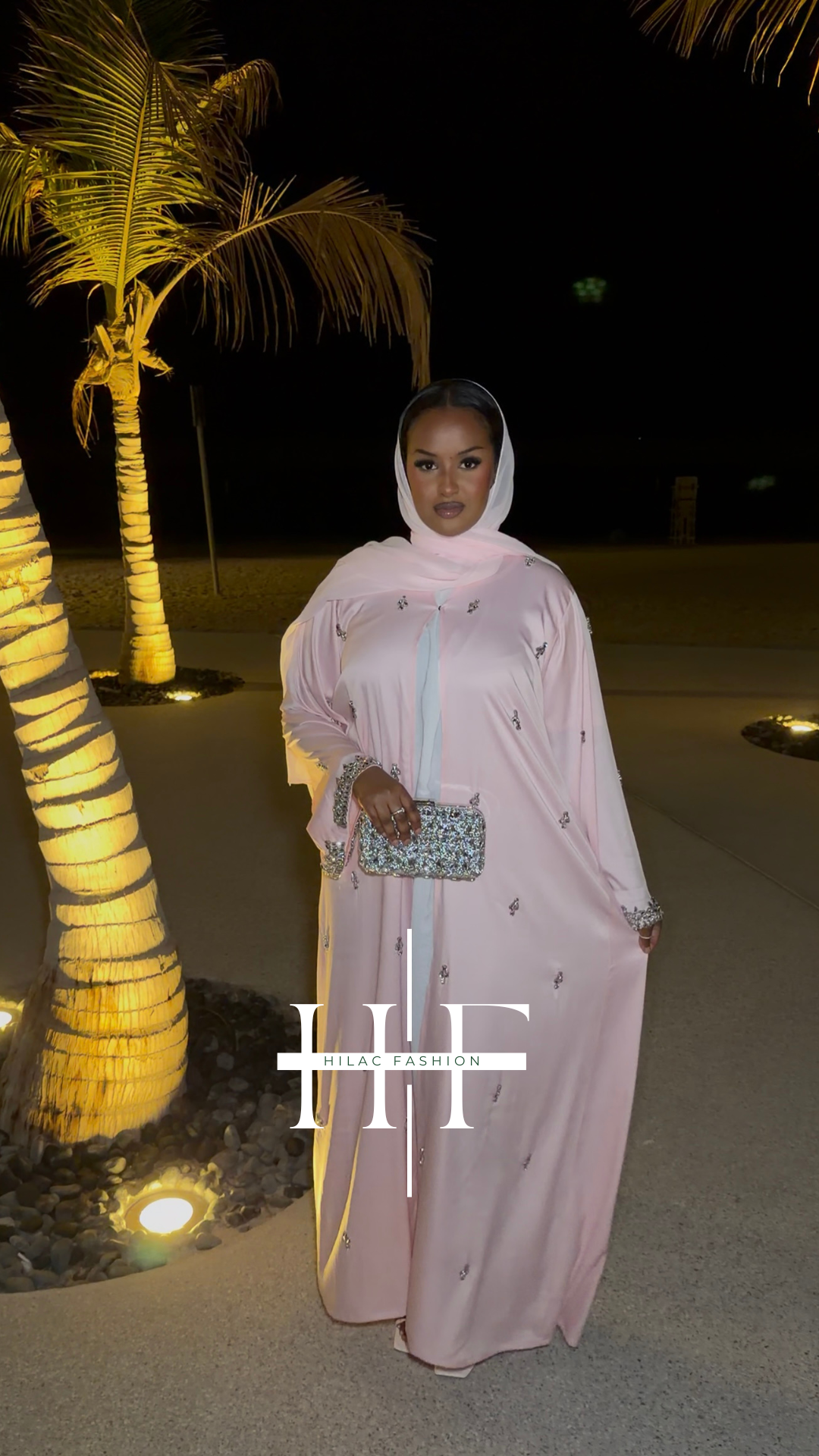 Luxury abaya in soft candy crepe, featuring wrist, body crystal stone work. Complete with matching underdress, and hijab for a glamorous look.
