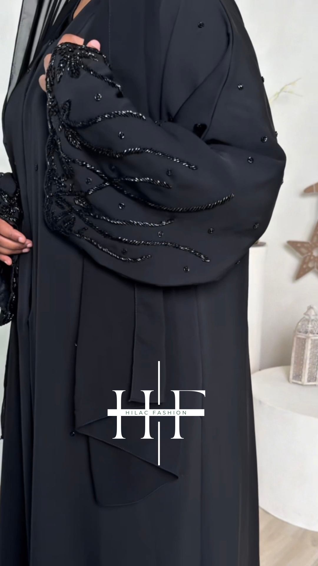 Sophisticated black abaya in soft Korean Nida, detailed with black leaf handwork. Includes hijab and underdress.
