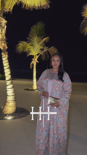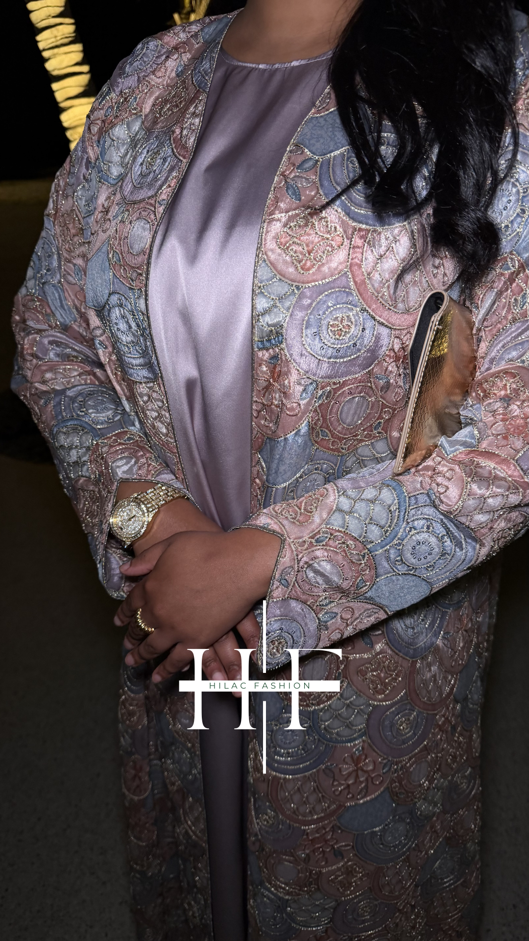 Intricately embroidered with delicate detailing, this lilac satin abaya blends soft shimmer with statement elegance.