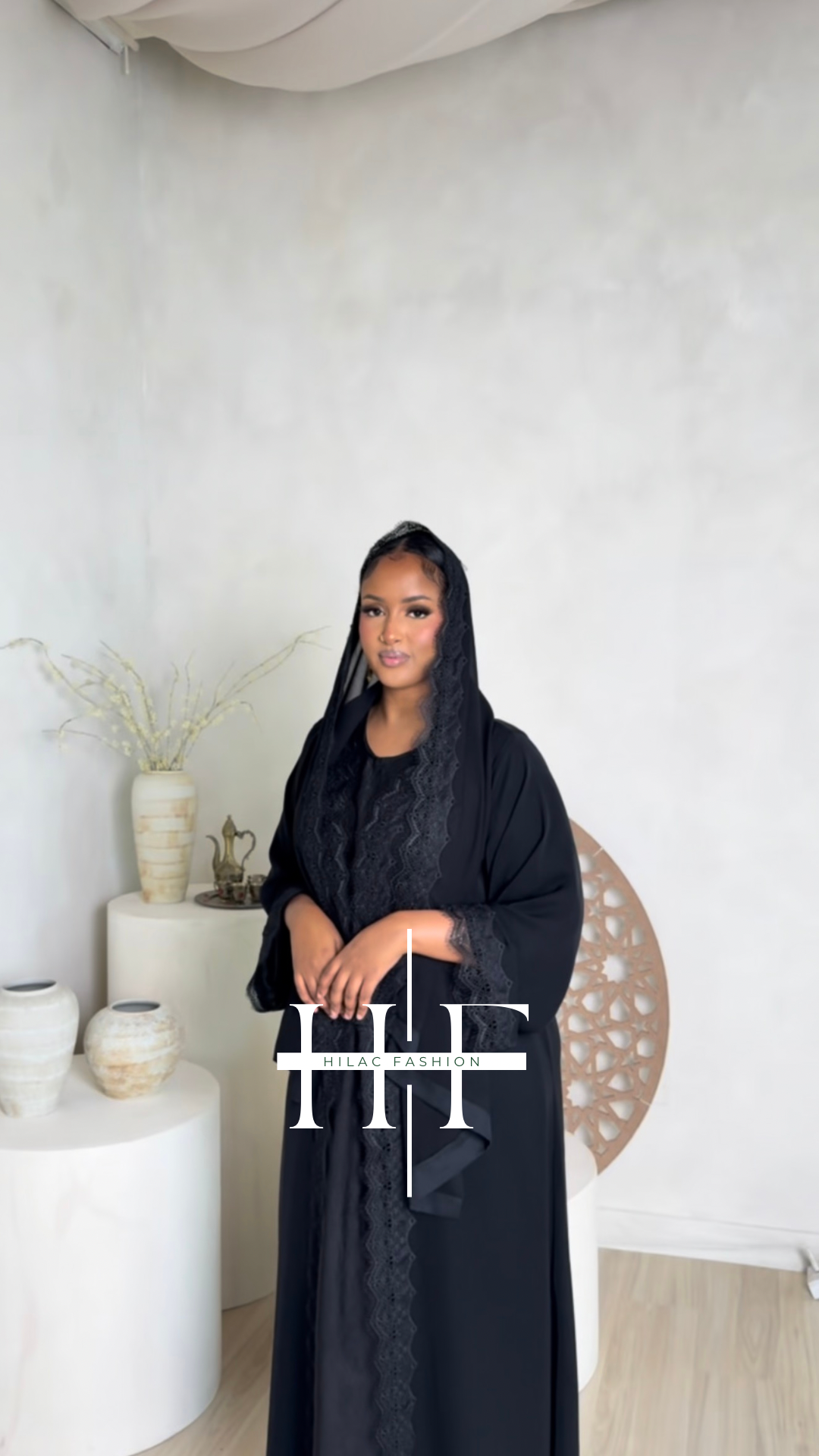 Crafted from the finest Nida Korean material in Black. This elegant abaya features delicate black lace trim along the front border, wrists, and matching hijab.