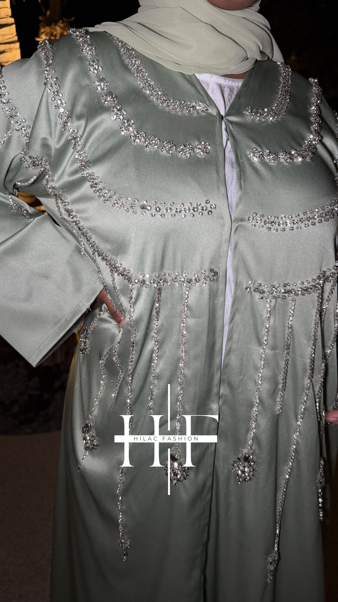 Luxury abaya in soft candy crepe, featuring crystal stone work. Complete with a underdress, and hijab for a glamorous look.