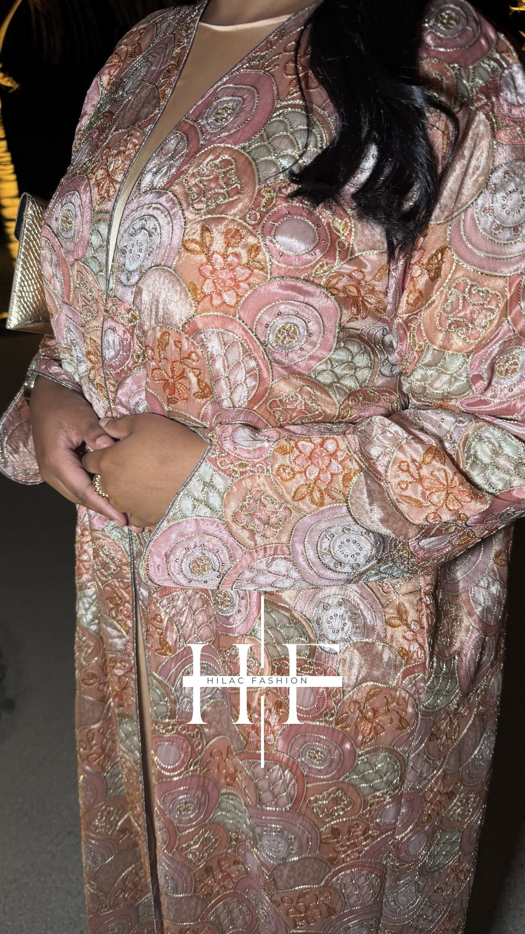 Intricately embroidered with delicate detailing, this peach satin abaya blends soft shimmer with statement elegance.