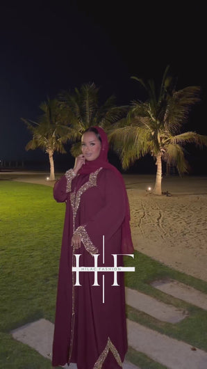 Crafted from the finest Nida Korean material in wine cascade, this elegant abaya features delicate gold beading along the chest, arms and bottom.